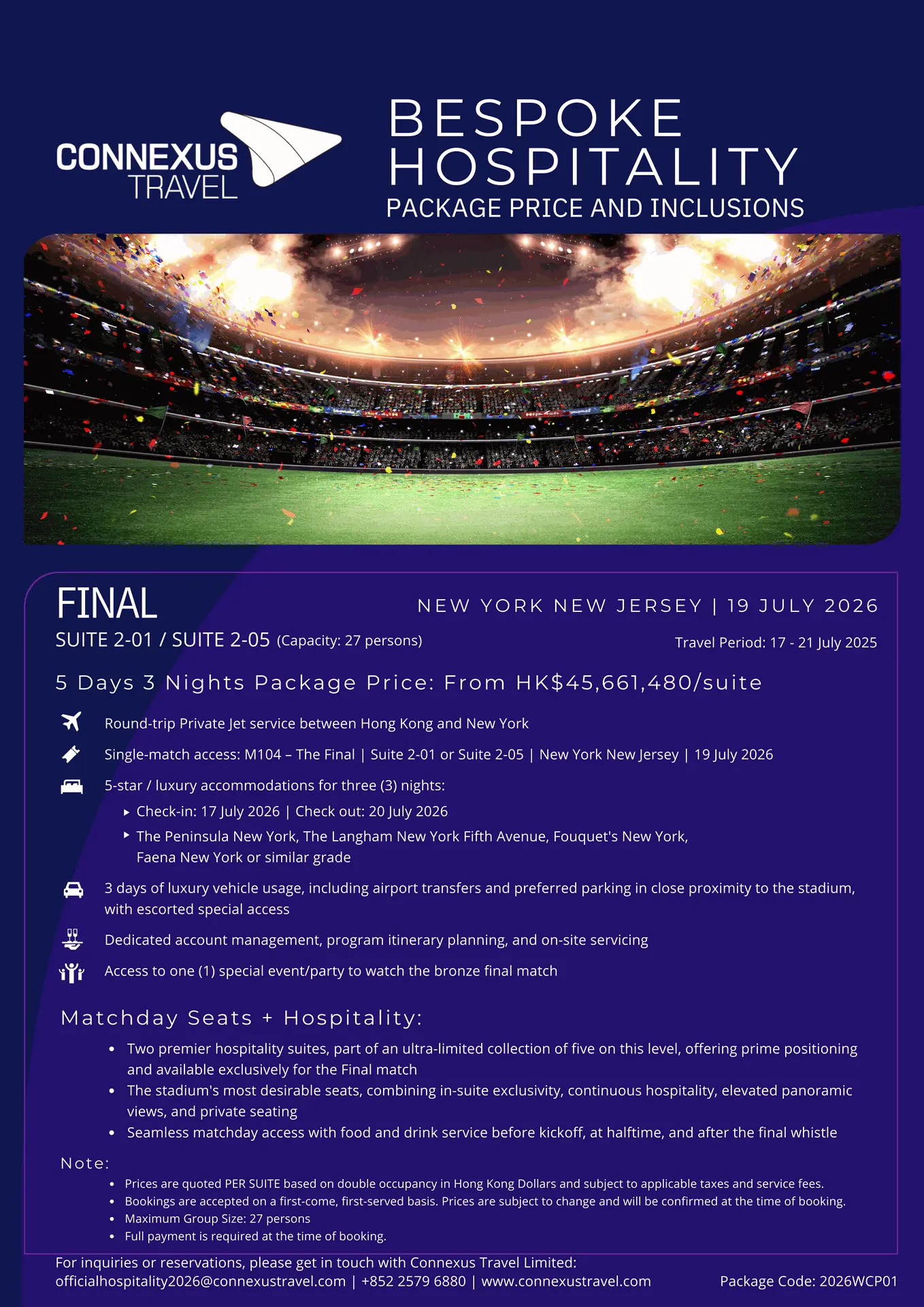 - Single-match access: M104 – The Final | Private Suite 2-01 or 2-05 | New York New Jersey | 19 Jul 2026