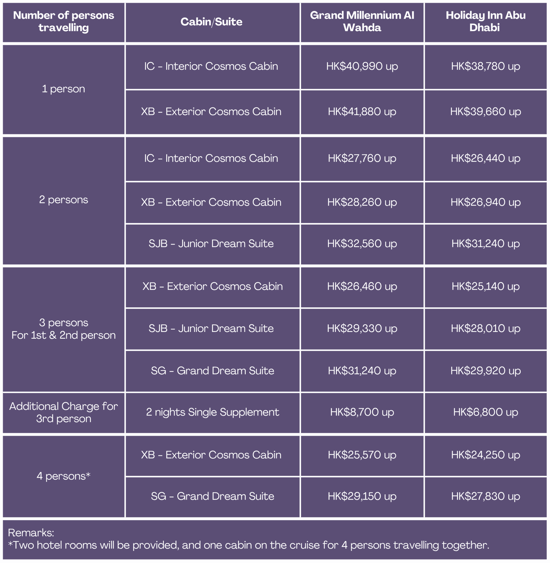 - Package price is per person based on double occupancy in Hong Kong Dollars. A surcharge will be applied where applicable, subject to availability.