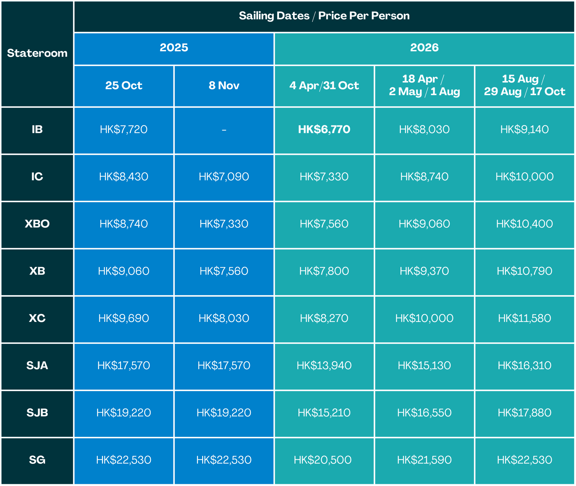 - Cruise prices are quoted per person based on double occupancy in Hong Kong Dollars, provided for reference only, and are subject to availability, applicable surcharges, and final confirmation upon receipt of full payment.