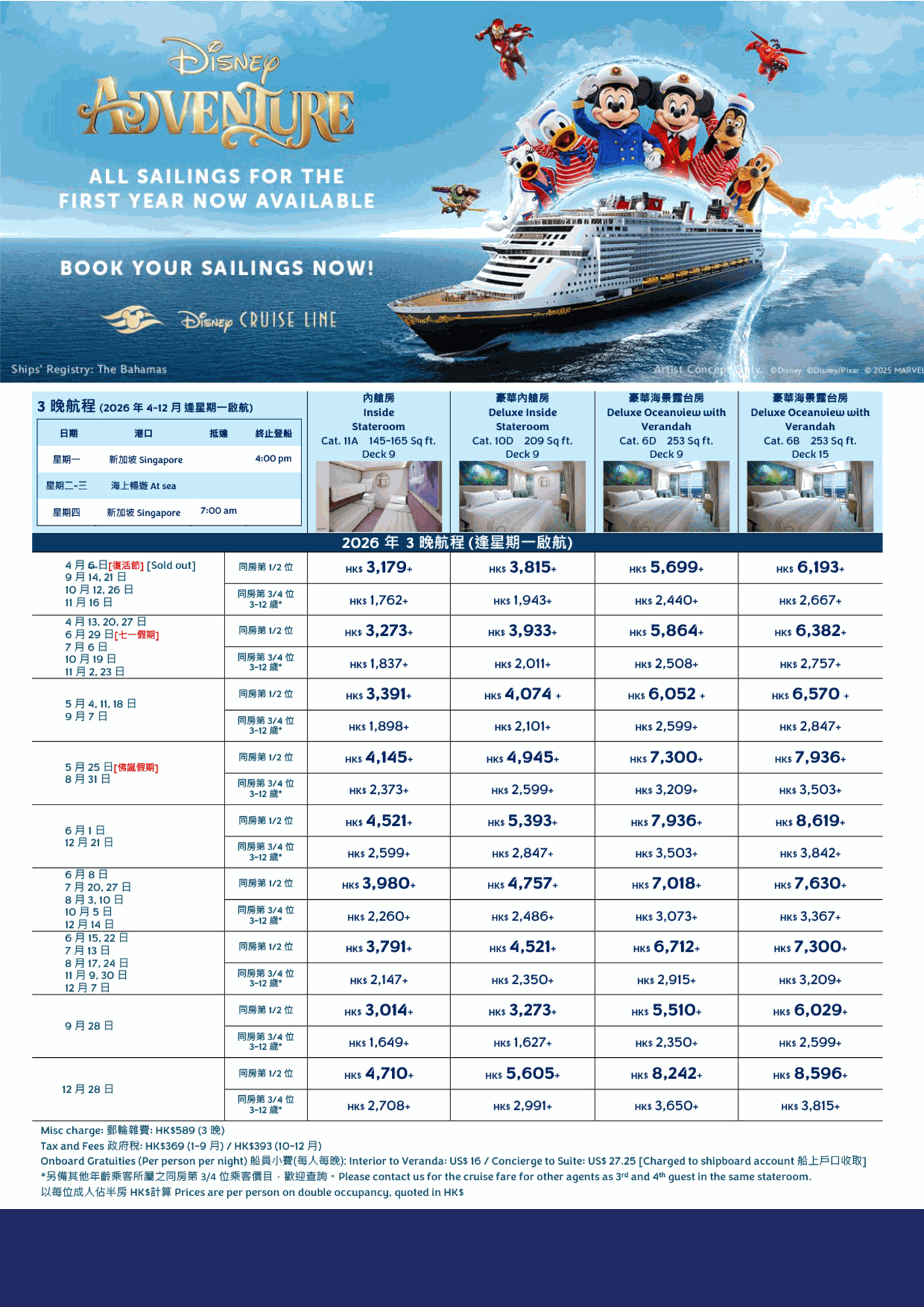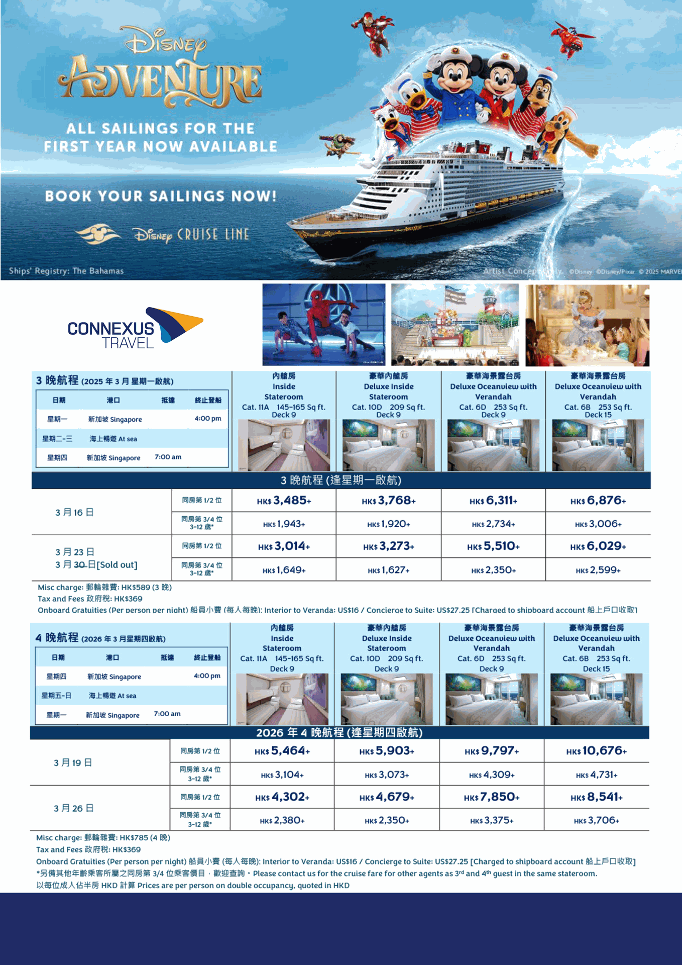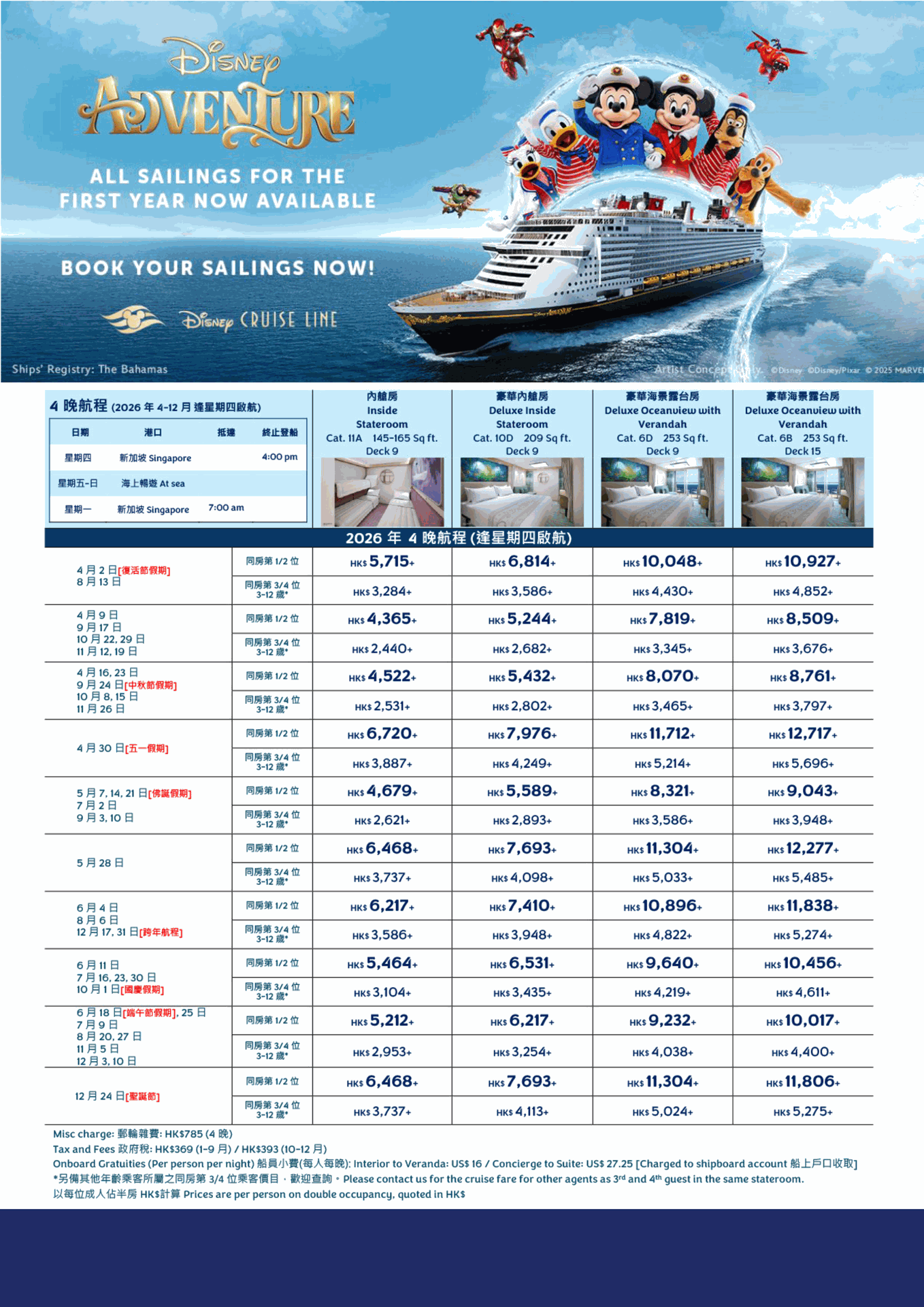- 3-4 nights Disney Adventure cruise onboard, inclusive of accommodation, meals, entertainment and access to facilities